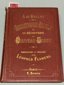 * BELLOY (Auguste de). Christophe Colomb et la découverte du Nouveau Monde. Paris, Ducrocq, [1889]. In-4, cartonnage éditeur toilé rouge, titre doré au dos et plat sup., tranches dorées (mors sup. fendu, coiffes et coins émoussés, coiff sup....