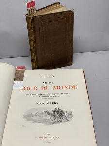 déchirée sans manque). Illustré de 40 gravures sur bois dessinées par A. de Neuville et une carte. On joint : HOCHE (Jules). Notre tour du monde. 226 illustrations par Allers. Paris, Juven, (vers 1900). Grand in-4, demi-chagrin rouge époque, marque de la ville de Paris au plat sup. (accroc à la coiffe de tête, l'autre frottée). Soit 2 volumes.
