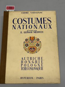 * VARAGNAC (André). Costumes nationaux. Dessinés par Lepage-Medvey. Autriche, Hongrie, Pologne, Tchécoslovaquie. Paris, Hypérion, 1939. In-4, cartonnage éditeur, dos toilé (cartonnage sali). 40 planches en couleur.