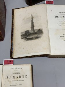Villevieille, Ch. Yriarte, soit un frontispice et 8 planches gravées sur bois. - CAUNTER (John Hobart). Tableaux pittoresques de l'Inde Traduction par P.J. Auguste Urbain Paris, Bellizard, 1834. In-8, demi-basane brun à coins, double filets dorés (dos usé avec lacunes, coins frottés, rousseurs, 2 pl. manquent). Ouvrage illustré d'un frontispice et de 23 (sur 25) gravures d'après le peintre William Daniell. Première partie seule (sur 3 parues). - WIENER (Charles). Chili et Chiliens. Paris, Cerf, 1888. Grand in-8, demi-chagrin rouge à coins, filets dorés, tête dorée (coins et coiffes émoussés, papier jauni). Illustré d'après des photographies. - BEAUVOIR. Voyage autour du monde. Australie, Java, Siam, Canton, Pékin, Yeddo, San Francisco. Paris, Plon, 1878. Fort grand in-8, demi-basane havane époque (dos et coins frottés, coiffes de tête déchirée, qq. salissures, un feuillet - frontispice ? - mq. entre titre et faux-titre). Amplement illustré de gravures sur bois dont un grand nombre à pleine page. Au plat sup. marque dorée " Cours gratuits du Grand Orient de France " et cachet " Trinosophes de Bercy " au v° du faux-titre. Soit 4 volumes.