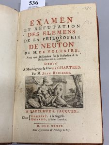 [Newton]. BANIERES (Jean). Examen et réfutation des élémens de la philosophie de Neuton de M. de Voltaire. Paris, Lambert, 1739. In-8, [2] f., XCVIII p., [5] f., 308 p., [2] f., basane havane mouchetée fin XVIIIe s., dos lisse orné, pièce de...