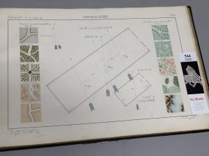 machine, lavis, levé de bâtiments, préliminaires, changements de plans de projection, topographie, rotations, intersections, problèmes divers, angles, plus courtes distances, trièdres, plans tangents, sections coniques, applications, plans cotés, ombres, surfaces héliçoïdes, cinématique, mécanique, hydraulique. Nombreux dessins au crayon, encre et aquarelle.