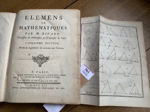 RIVARD (Dominique-François). Elémens de mathématiques. Paris, Desaint et Saillant, 1752. In-4, veau moucheté, dos à 5 nerfs, pièce de titre rouge, caissons ornés, tranches rouges (coiffes manquantes, charnières fendues avec manque, coins...