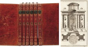 PROVENANCE : comte Nikolaï Alexandrovitch Koutchelov-Besberodko (1834-1862), grand collectionneur de tableaux et bibliophile, avec son ex-libris gravé à son chiffre au premier contre-plat et son étiquette de cote de bibliothèque à la fin de chacun des volumes -- comte A. Polovtsoff, Catalogue des livres et estampes relatifs à l'architecture et l'ornementation, Paris, H. Leclerc, 1910, n° 265 -- Emilio Terry, Bibliothèque Emilio Terry, Paris, Drouot, 1972, n° 214 -- H.-P. Kraus, Special Subject, Bulletin n° 6, ca. 1972, n° 35 -- Tom Taylor, Cat. 25, hiver 1979, n° 76