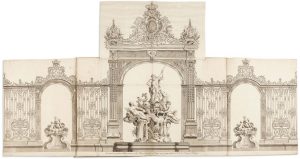 REFERENCE : Cohen-de-Ricci, 596 -- Berlin Kat., 1365 -- Jervis 1984, p. 281 Le serrurier et ferronnier Jean Lamour (1698-1779, avec l'architecte Emmanuel Héré (voir lot 25), réalisèrent pour la gloire du roi Stanislas Leczynski, et pour leur propre gloire, la place Royale de Nancy, renommée Place Stanislas en 1831. Des réalisations de ferronnerie de Jean Lamour, autres que celles concernant la place, sont présentées dans cet ouvrage, notamment les escaliers de sa propre maison ou son balcon de fer forgé. La planche de dédicace montre dans une vignette la visite du Roi Stanislas dans l'atelier de Lamour. Le soin apporté aux gravures est remarquable et plusieurs détails y figurent à l'échelle de leur exécution. D'autres planches sont composées de plusieurs feuilles de papier pour former des grandes images dépliantes. On notera aussi une planche intitulée Serrure gothique pour un coffre, objet extraordinaire qui figurait dans la collection personnelle du serrurierferronnier de Stanislas