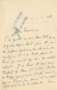 Je rentre toussant comme un malheureux, et ayant fait en somme une g[ran]de imprudence d'aller encore fiévreusement et si pris de la gorge, à ce festin grec. Je pense que je vais expier cela par quelques jours de lit. Après quoi je vous ferai signe, ayant très envie de causer avec vous des choses sérieuses qui intéressent, et de vous assurer de vive voix, enfin, de mes sentiments bien dévoués et bien sympathiques. Mettez tous mes hommages aux pieds de mademoiselle de Mornand...»