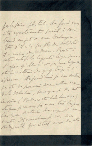 Aujourd'hui je ne sortirai pas et ne pourrai donc aller rue Ed[mon]d Valentin [chez Louisa de Mornand], parce que je suis sorti ce soir (Bibesco et Me Lemaire) et que je ne sors pas encore tous les jours bien que sortant beaucoup pl[us] souvent. Dimanche, je vais voir Radziwill [son ami Léon Radziwill, dit Loche, avec qui il était alors en froid] qui était aussi de votre partie de ce soir, vous ne me le dîtes pas, mais on m'écrit cela. Donc je ne pourrai pas non plus. Et lundi non plus, parce que je serai parti dimanche. - Je voudrais savoir quand vous revenez (si votre absence à partir de samedi durera longtemps) de façon que si j'avais q[uel]q[ue] chose à vous dire je sache où vous l'adresser. Merci de votre aimable et patiente visite d'hier.