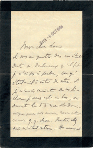 PROUST (Marcel) — LETTRE AUTOGRAPHE signée «Marcel». — S.l., [date du 8 octobre 1904]. — 4 pp. in-8, liseré de deuil ; date de réception au composteur.