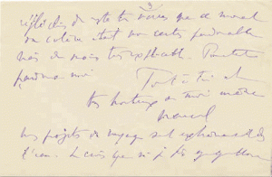 «Mon cher Louis, je suis extrêmement mal à l'aise en ce moment, j'ai pris froid en me changeant cette nuit et je pense que cela ne sera absolument rien mais je suis trop fatigué pour écrire longuement. Je veux seulement te dire combien je suis triste de penser à la fois que tu ne voudras plus avoir d'amitié pour un garçon insupportable - et peut-être plus encore de penser que j'ai méconnu tes bontés pour moi, par les paroles que j'ai prononcées, ou du moins que tu dis que j'ai prononcées (ce qui est la même chose) car j'étais trop en colère pour me rendre compte et maintenant me rappeler. Mais là comme en tout, je m'en rapporte à ta parole. Si tu y réfléchis, du reste, tu verras que ce moment de colère était non certes pardonnable mais du moins très explicable.