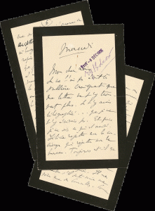 Merci encore, mon cher Louis, je me demande si mon appartement du bd Hausmann, bien meublé comme il peut être, ne te conviendrait pas pour cet été, en attendant que ton hôtel soit prêt. Mais je crois qu'il serait un peu petit "Monsieur, Madame, et bébé" [allusion au roman à succès du même titre de Gustave Droz]. Tendrement à toi... Es-tu au courant de cette ancienne affaire Simeoni de Flérès ? [Allusion à Filippo Simeoni, dit de Flérès, banquier véreux ayant sévi plusieurs fois dans les milieux aristocratiques au cours des années 1890-1900.]»