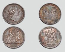 DEUX MÉDAILLES EN ARGENT : Mariage du Dauphin et de Marie-Antoinette, 1770, gravée par : “B. DUVIVIER”, l'une avec à l'avers les portraits du Dauphin et de Marie-Antoinette, l'autre avec le portrait de Louis XV ; diamètre 41,5 mm, poids 31 et...