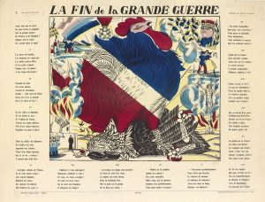Raoul Dufy (1877-1953) La Fin de la Grande Guerre. 1915. Bois gravé et texte typographié. [620 x 470]. Très belle épreuve sur vergé mince, coloriée au pochoir et numérotée à la mine de plomb. Toutes marges. Tirage à 100 épreuves.