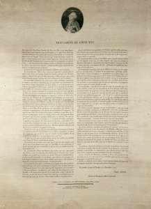 TESTAMENT de LOUIS XVI, fait au Temple le 25 décembre 1792, copie du Cardinal de Montmorency-Laval, grand aumônier de France en 1786; “Imprimé sur soie à Londres par W. BULMER pour M. PELTIER, N° 11, Ponton-street, Haymarket”; exemplaire...