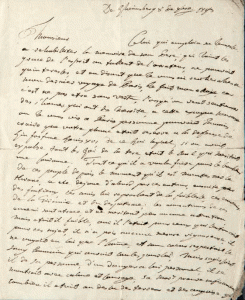 “Celui qui emploia sa jeunesse à rehabiliter la mémoire de son père, qui joint les graces de l'esprit au tallent de l'orrateur, ne pouvait qu'interesser, [...] à cette epoque heureuse ou je vous vis à Paris personne pouvoit jamais croire que votre plume etoit reservé à la defense de l'infortuné Louis XVI, de ce Roi lequel, si on avoit expulsé tout les Roi de la tere, était le seul qui meritoit une Couronne.