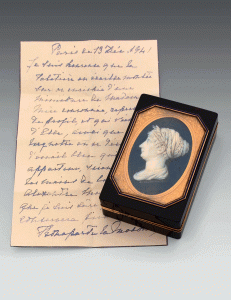 “Je suis heureuse que la tabatière en écaille montée sur or, enrichie d'une miniature de Madame mère couronnée, représentée de profil et qui vient d'Elle, ainsi que la lorgnette en or décorée d'émail bleu qui lui a appartenu, soient entre les mains de la Princesse Alexandre Murat, parce que je suis sûre qu'elle les conservera précieusement. Bonaparte de la Moskowa”.