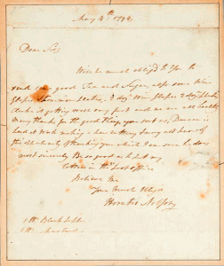 Il le prie d'envoyer du bon thé et du sucre, ainsi que quelques verres à vin et des assiettes ordinaires; 2 douzaines de verres à vin et 2 douzaines d'assiettes. Clarke se rétablit très vite et ils sont tous en bonne santé. Il remercie Pollard de toutes les bonnes choses qu'il a envoyées. Duncan travaille dur à faire une batterie à poules... Il voudrait aussi du poivre noir et de la moutarde... Il ajoute au dos la demande d'un fût de porter [bière brune], non mise en bouteille...
