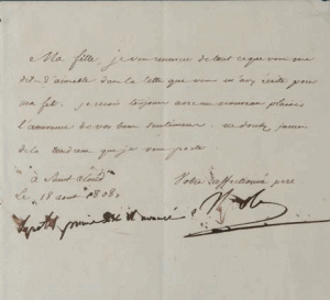 “Ma fille, je vous remercie de tout ce que vous me dites d'aimable dans la lettre que vous m'avez écrite pour ma fête. Je reçois toujours avec un nouveau plaisir l'assurance de vos bons sentimens. Ne doutez jamais de la tendresse que je vous porte”...