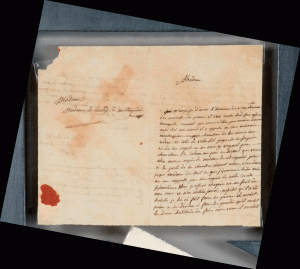 • une L.A.S. de Julie SOUFFLOT (1774-1854), sous-gouvernante du Roi de Rome, à la Comtesse de MONTESQUIOU, lui racontant comment s'est comporté le prince depuis son départ la veille: sa nuit, sa surprise et son chagrin de ne pas retrouver à son réveil “la chere maman Montesquiou”; elle lui a fait faire ses prières, ses leçons de lecture et d'allemand. Elle évoque avec tristesse leur cruelle séparation... (3 p. in-8, adresse).