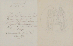 Nicolas-Guy-Antoine BRENET (1770-1846) médailleur — DESSIN original signé “B” avec légende manuscrite, mai 1815 ; 20 x 15 cm à la mine de plomb sur papier calque contrecollé avec légende en regard (1 p. in-8) ; encadré.