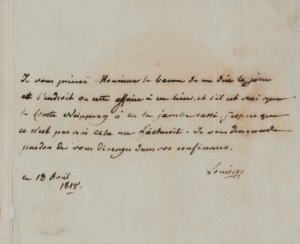 [La lettre est adressée au diplomate autrichien qui faisait valoir ses droits au Congrès de Vienne. Neipperg commandait alors en Italie une division de l'armée autrichienne.] “Je vous prierai Monsieur le baron de me dire le jour et l'endroit où cette affaire a eu lieu, et s'il est vrai que le Comte NEIPPERG a eu la jambe cassé, j'espère que ce n'est pas vrai cela me fâcheroit. Je vous demande pardon de vous déranger dans vos conférences”...