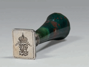 SCEAU À CIRE, probablement du Prince impérial, en argent, rectangulaire aux chiffres : “N” et double: “E”, surmontés de la couronne impériale ; manche rond en jaspe sanguin ; sceau 26 x 21,5 mm, hauteur totale 87,5 mm.
