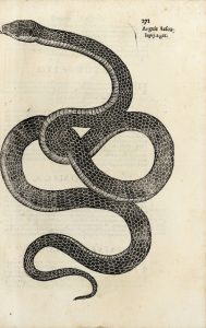 Saisissante illustration composée de 61 remarquables figures d'erpétologie gravées sur bois, les mêmes que dans la première édition, dont 32 serpents à pleine page dans la première partie et 14 dragons, basilics, hydres et autres créatures fantastiques dans la seconde. L'Histoire des serpents et des dragons forme le dixième des treize volumes d'œuvres complètes d'Ulisse Aldrovandi (1522-1605) publiées entre 1599 et 1668, en latin. « Ce corps d'histoire naturelle constate l'état de la science au commencement du XVIIe siècle, et sous ce rapport mérite de conserver une place dans les grandes bibliothèques », écrit Brunet.