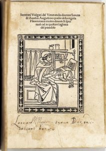 élégamment imprimé en lettres rondes, est orné d'un bois sur le titre représentant saint Augustin rédigeant ses sermons.