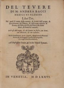 BACCI (Andrea). Del Tevere libri tre, ne' quali si tratta della natura, & bontà dell'acque antiche di Roma. Venise, [Alde le Jeune], 1576. In-4, vélin souple, traces d'attaches (Reliure de l'époque). Seconde édition, en partie originale, de cet...