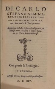 Première édition italienne du Seminarium sive plantarium, traduite par Pietro Lauro. « La vigne n'est citée dans cet ouvrage que pour mémoire ; par contre, on y trouve maints détails sur les pommiers, poiriers et autres arbres dont les fruits servent à faire des boissons » (Simon).