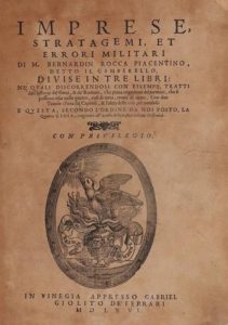 ROCCA (Bernardino). Imprese, stratagemi, et errori militari. Venise, Gabriel Giolito de' Ferrari, 1566. In-4, veau marbré, double encadrement de roulettes et filets dorés avec fleurons d'angles, dos orné, tranches marbrées (Reliure du XVIIIe...