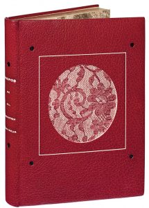 DETŒUF (Auguste). Propos de O. L. Barenton. Confiseur. Paris, Éditions du Tambourinaire, 1950. In-8, maroquin rouge mosaïqué, composition végétale composite blanche et rose, tête dorée, non rogné, couverture, chemise, étui (Reliure moderne).