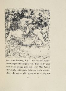 156 lithographies originales de Pierre Bonnard. ¶ Tirage à 250 exemplaires, celui-ci l’un des 200 sur papier de Hollande. « Ces nus candides, cette grâce première dans les attitudes, ces campagnes où palpite le feuillage sous la lumière de l’été, ces grèves, ces cours de ferme où l’attention complaisante du peintre — comme celle du narrateur — fixe la vie quotidienne par l’humble détail, et même ces notations qui confondent gaminerie de Bonnard et malice attendrie du conteur […], déroulent autour du couple le mouvement de la vie naissante, les élans, les reprises, les abandons de l’amour à ses débuts. Cette jeunesse correspond sûrement à un penchant profond de la nature de Bonnard. Il excelle à en traduire l’impondérable nouveauté. » (F. Chapon, Le Peintre et le livre, p. 68).