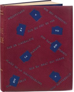 SALMON (André). Rive Gauche. Quartier Latin - Plaisance - Montparnasse - Les Quais - Saint-Germain-des-Prés. Paris, chez l'auteur, 1951. In-folio, maroquin bordeaux mosaïqué de noms de rues et de plaques portant des chiffres d'arrondissements...