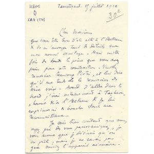 7. FOUCAULD (père Charles de). L. A. S. Tamanrasset, 15 juillet 1910 ; 5 p. in-12. Apostille du même jour. C. de F. remercie le colonel pour les nouvelles de l’ermitage en construction dans l’Assekrem. Il souhaite également remercier de vive...