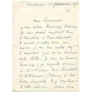 traduit la lettre du colonel. Il « regrette vivement la désobéissance dont Boukhelil et Mohammed (Aklessou) se sont rendus coupables », et le remercie de son indulgence pour eux. Il le félicite également d’avoir mis le fils d’Abidin en déroute. Il est rentré heureux de son voyage en France, où il a été très bien accueilli. À In Salah, le commandant Payn s’est lui aussi montré très bon. Il a donné l’autorisation à Moûsa d’« aller chercher ma femme dans l’Aorar ». Il s’excuse de ne pas apposer son cachet à la lettre, et salue le colonel « beaucoup beaucoup ». Déchirures aux plis, sans manque.