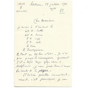 FOUCAULD (père Charles de). 2 L. A. S. • Assekrem, 12 juillet 1911 ; 2 p. in-12. C. de F. remercie de l’approvisionnement : il a bien reçu les dattes, le sucre, le café, le sel, les sacs « et Duveyrier. » (Sans doute Henri Duveyrier,...
