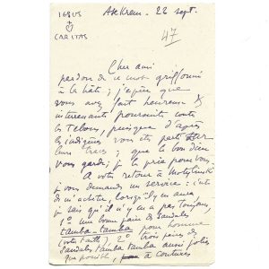 fasse parvenir trois paires de sandales : une paire pour homme et trois, « aussi jolies que possible » pour enfants. Les chaussures sont destinées au colonel Laperrine et pour ses neveux ou nièces, tous admiratifs des sandales « tamba-tamba ». Au docteur, il réclame de quoi lutter contre les chacals et souris. Il a reçu des nouvelles du colonel, qui parle « bien affectueusement » du colonel Sigonney. • 6 octobre 1911 ; 4 p. in-8. C. de F. exprime sa reconnaissance pour les lettres et pour les sandales. Il demeure sans nouvelles du général Baillard, mais espère sa venue. Il a reçu de nombreuses visites de nomades. Il se réjouit que la région d’Assekrem ait été épargnée par la sècheresse : les trois pluies ont fait affluer les bergers, accompagnés de leurs troupeaux. La végétation, elle aussi, s’en porte mieux, mais bénéficierait de pluies supplémentaires – elle est, en l’état, insuffisante pour la consommation animale. Les températures, elles, sont estivales. C. de F. demeure sans nouvelles du colonel Laperrine. Il exprime sa satisfaction de savoir le colonel Sigonney de retour à Motylinski, après un séjour difficile à Arokam, au Sahara. Il renouvelle son invitation, en rappelant que « la bonne fraternité supplée à ce qui manque comme confort », et transmet ses meilleurs souvenirs à Barbier, François, Piétri et Ouenni.