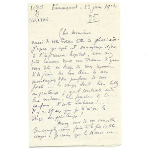 FOUCAULD (père Charles de). L. A. S. Tamanrasset, 23 juin 1912 ; 4 p. in-12. Le colonel est actuellement dans les Vosges. « J’espère qu’après cet ennuyeux séjour à l’infirmerie-hôpital, vous avez fait heureuse route vers [la] France et...