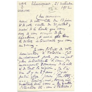 FOUCAULD (père Charles de). L. A. S. Tamanrasset, 21 septembre 1912 ; 6 p. in-12. C. de F. remercie son correspondant de ses lettres et de s’occuper de la carabine, et le félicite de sa nomination à Tebessa, où il a lui-même séjourné en...