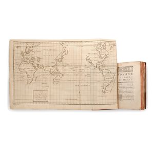 verte, [rel. de l’époque], usagée. Grande carte et 20 (sur 34) planches repliées de vues, plans, cartes, etc. gravées sur cuivre. En guerre contre l’Espagne, l’Angleterre désigna l’amiral Anson pour diriger une flotte de six navires destinés à attaquer les possessions espagnoles en Amérique. L’escadre toucha le Brésil et fit route jusqu’à la Patagonie. Dans le détroit de Magellan, Anson perdit quatre de ses navires et les deux tiers de ses hommes. Il continua cependant sa route dans le Pacifique jusqu’aux Philippines et à Macao, fit de nombreuses prises et rentra chargé d’un important butin. Ex-libris manuscrit Joannes Carolus Ledesma. Brunet, I, 304 (cite les éditions au format in-4). Chadenat, n° 5879. Sabin, I, n° 1638.