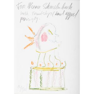 gravité à celle-ci). Exemplaire du tirage courant de cette belle monographie très abondamment illustrée en couleurs. Grand dessin original aux feutres de couleurs, signé de Karel Appel, avec un envoi autographe signé au crayon à Werner Schmalenbach, historien de l’art, commissaire d’exposition pour la Biennale de Venise de 1960 à 1990.