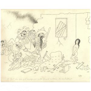 des 150 exemplaires numérotés réimposés sur papier vélin d’Arches (n° 1), avec un grand et beau dessin original à l’encre de Chine, sur traits de crayon, pour une illustration à double page. La justification est signée par Dubout et paraphée par l’éditeur. L’ouvrage est accompagné d’un autre exemplaire, avec les figures en noir, sur papier vélin non filigrané (Condat ?) et justifié n° 1 également, sous chemise commune. Monod, 4288.
