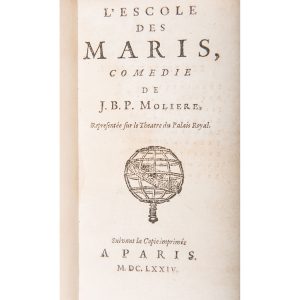 MOLIÈRE. L’Escole des maris, comédie de J.B.P. Moliere, Representée sur le Theatre du Palais Royal. Suivant la copie impr. à Paris [marque à la sphère : Amsterdam, Daniel Elzevier], 1674 ; in-16, veau raciné, deux filets à froid en...