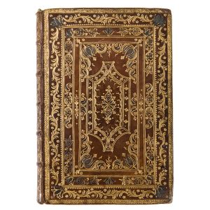 fleurons évidés dorés peints, dos à nerfs orné de fleurons dorés, tranches dorées, traces de fermoirs en gouttière, doublures de papier gaufré doré, [rel. de l’époque], coiffe supérieure absente, coins un peu émoussés. Frontispice, 13 figures hors texte et culs-de-lampe gravés sur cuivre. Rousseurs. Belle reliure (italienne ?) au décor archaïsant rappelant les décors mosaïqués du XVIe s.