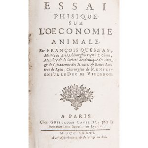 QUESNAY (François). Essai phisique sur l’œconomie animale. Paris, Guillaume Cavelier, 1736 ; in-12, veau brun, dos à nerfs orné de motifs dorés, [rel. de l’époque], frottée, accrocs aux coiffes. Édition originale. Une des premières...
