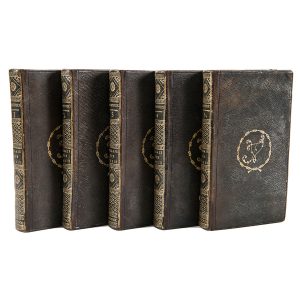orné de motifs dorés, tranches dorées, doublures et gardes de papier gaufré doré, [rel. du XIXe s.], quelques légers frottements. Les dos d’une reliure du tout début du XIXe siècle ont été montés sur ces reliures plus tardives. Mouillure claire affectant le troisième volume, sinon bel exemplaire. Cachet humide Eugène de Froberville. Monogramme FV doré au centre des plats.