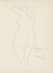 Édition originale illustrée d'une eau-forte originale de Pablo Picasso et d'un burin original de Paul Lemagny. ¶ Tirage à 125 exemplaires, tous sur papier vélin d’Arches. ¶ « Ce livre, publié à l’occasion du 75e anniversaire de Picasso, témoigne d’un attachement, auquel le peintre, cependant, ne tenait plus tellement. Cela explique que la gravure accompagnant le livre date du 22 décembre 1956, alors que le texte avait été imprimé deux mois auparavant ; et ce n’est sans doute pas un hasard si Picasso trace un corps de femme bien en chair pour celui dont il sait qu’il préfère les corps déliés. » ¶ (S. Goeppert – H. Goeppert-Franck – P. Cramer, Pablo Picasso. Catalogue raisonné des livres illustrés, p. 210). mm. S. Goeppert – H. Goeppert-Franck – P. Cramer, Pablo Picasso. Catalogue raisonné des livres illustrés, n° 80, p. 210.