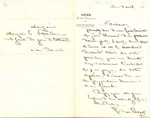 Petrus BOREL (1809-1859). L.A.S., Paris, 3 avril [1844], au Président de la Société des Gens de Lettres [Arsène Houssaye] ; 1 page in-8 à en-tête du journal Satan avec vignette gaufrée, adresse. Il se présentera le lendemain jeudi...