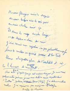 il s’est remis à peindre, mais se sent à bout de forces… Sur le feuillet, deux amusants poèmes, sortes de chansons à boire : « 3 femmes d’ivrognes »…, et « Monsieur Flênejine aime la chopine »… Le premier (12 vers) se présente seul sur toute la première page, daté et signé :