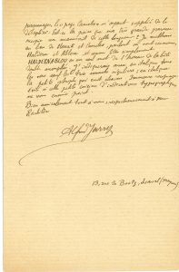 Suite à son absence imprévue, il demande deux services : il regrette de manquer la pièce Le Vendeur de Soleil [de Rachilde] sur laquelle il voulait écrire un compte rendu dans L’Art Littéraire, et demande qu’on donne une des places que Mme Rachilde lui avait promises à Léon-Paul Fargue. Il lui demande aussi l’envoi du dernier Mercure, pour y relire la conférence de Laurent Tailhade… Après mûre réflexion avec Remy de Gourmont, Jarry souhaite « changer le titre de la pièce et changer aussi les noms des personnages, le “page Cameleo” m’ayant supplié de le débaptiser […]. Je mettrai au lieu de Henrik et Cameleo, partout où sont ces noms, Haldern et Ablou, et comme titre simplement Haldernablou en un seul mot de l’horreur de la bête double accouplée. J’indiquerais aussi en italique tous les vers sauf les trois sonnets réguliers ; en italique la petite strophe qui suit chacun. Immense recopiage évité si cette petite cuisine d’indications typographiques ne vous ennuie point »…